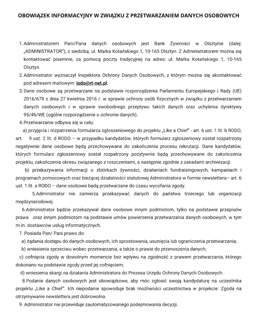 Udział w kursie jest bezpłatny. Zapewniamy odzież ochronną, wyposażenie kuchni oraz wszystkie niezbędne produkty. Od uczestników oczekujemy jedynie zaangażowania i regularnego udziału w zajęciach.
